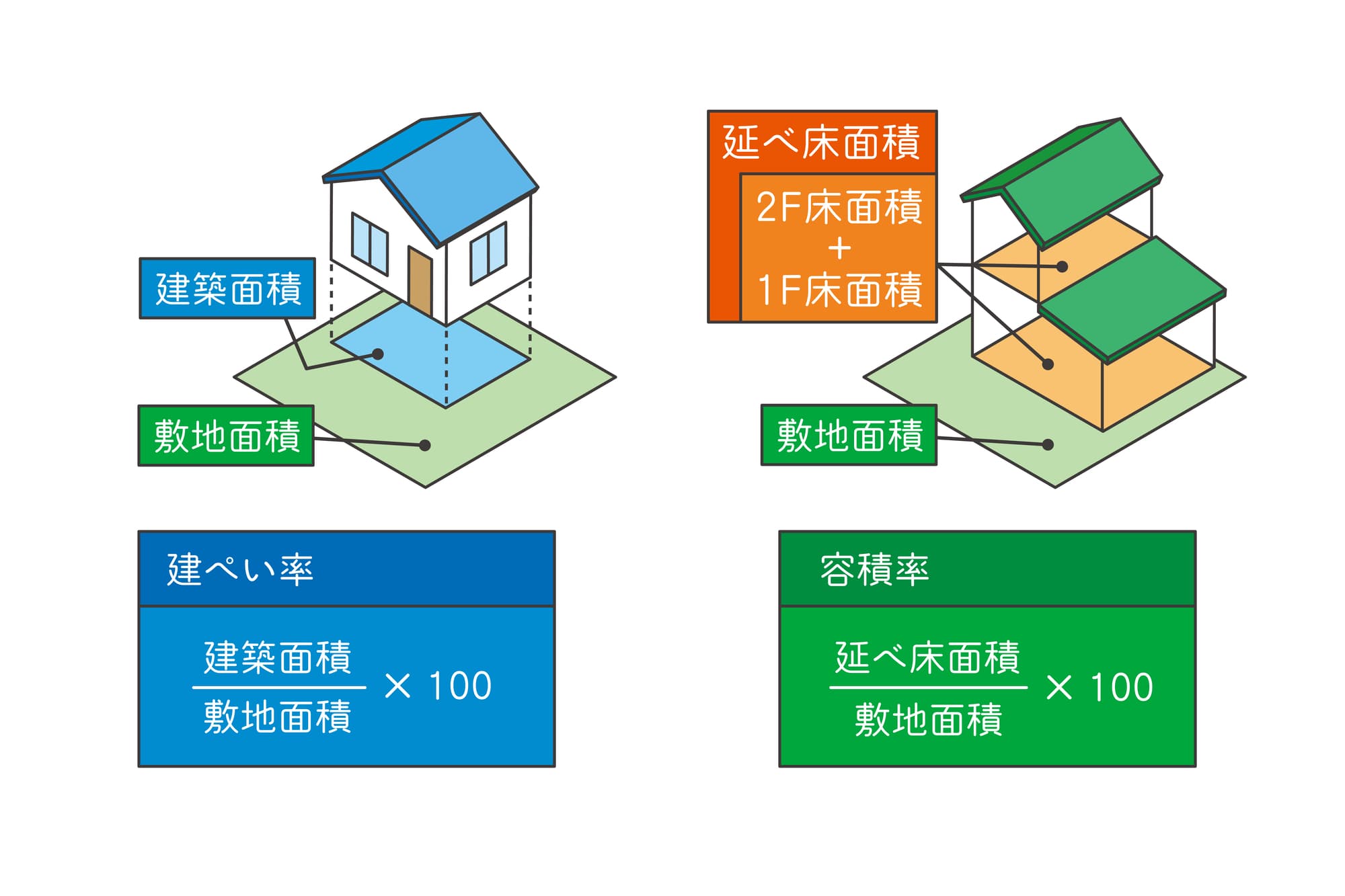 建ぺい率(%)= 建築面積 ÷ 敷地面積 × 100